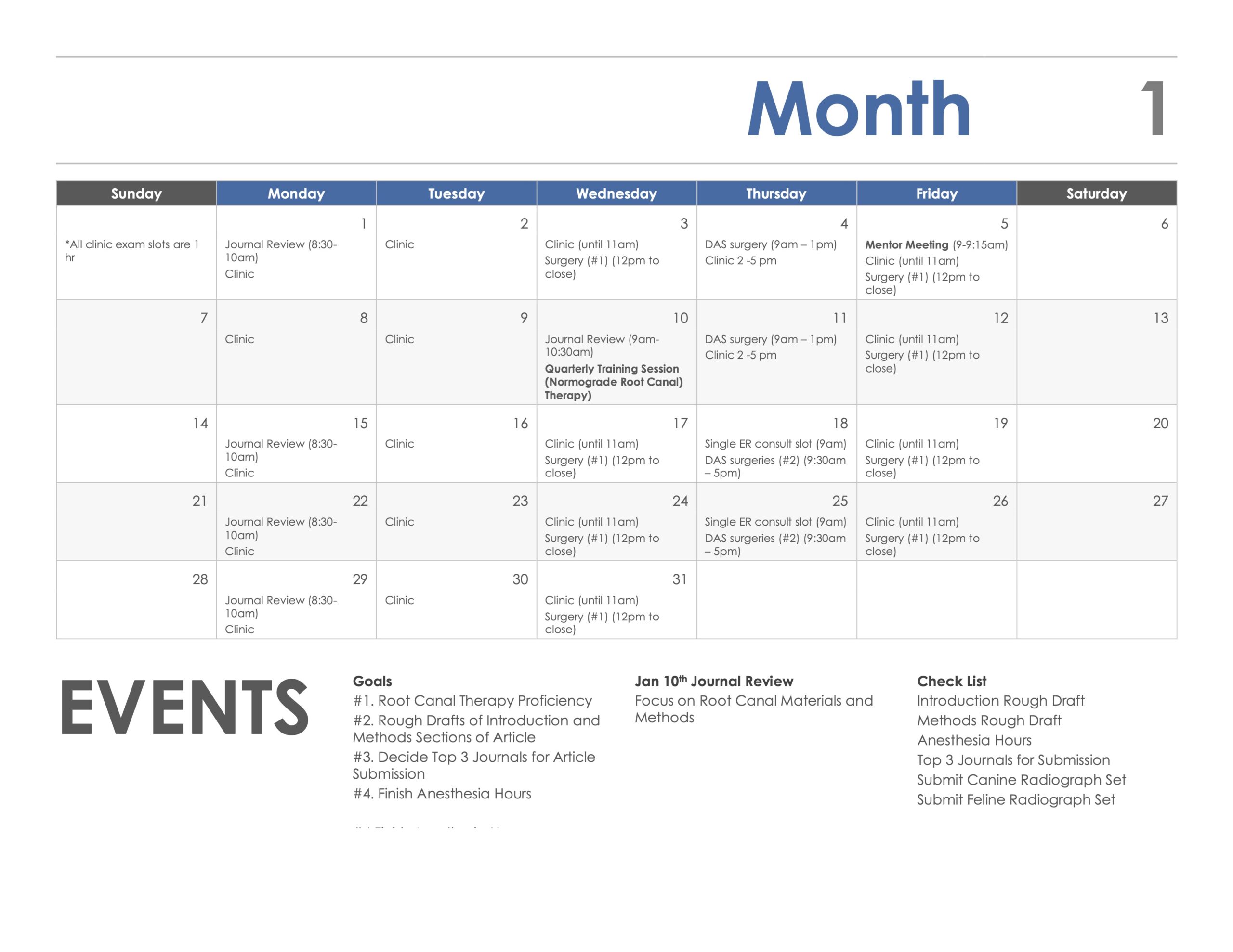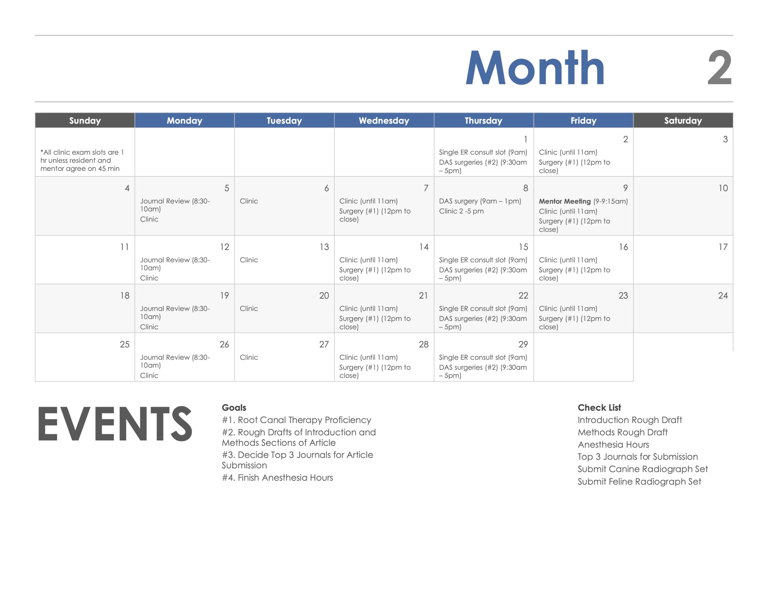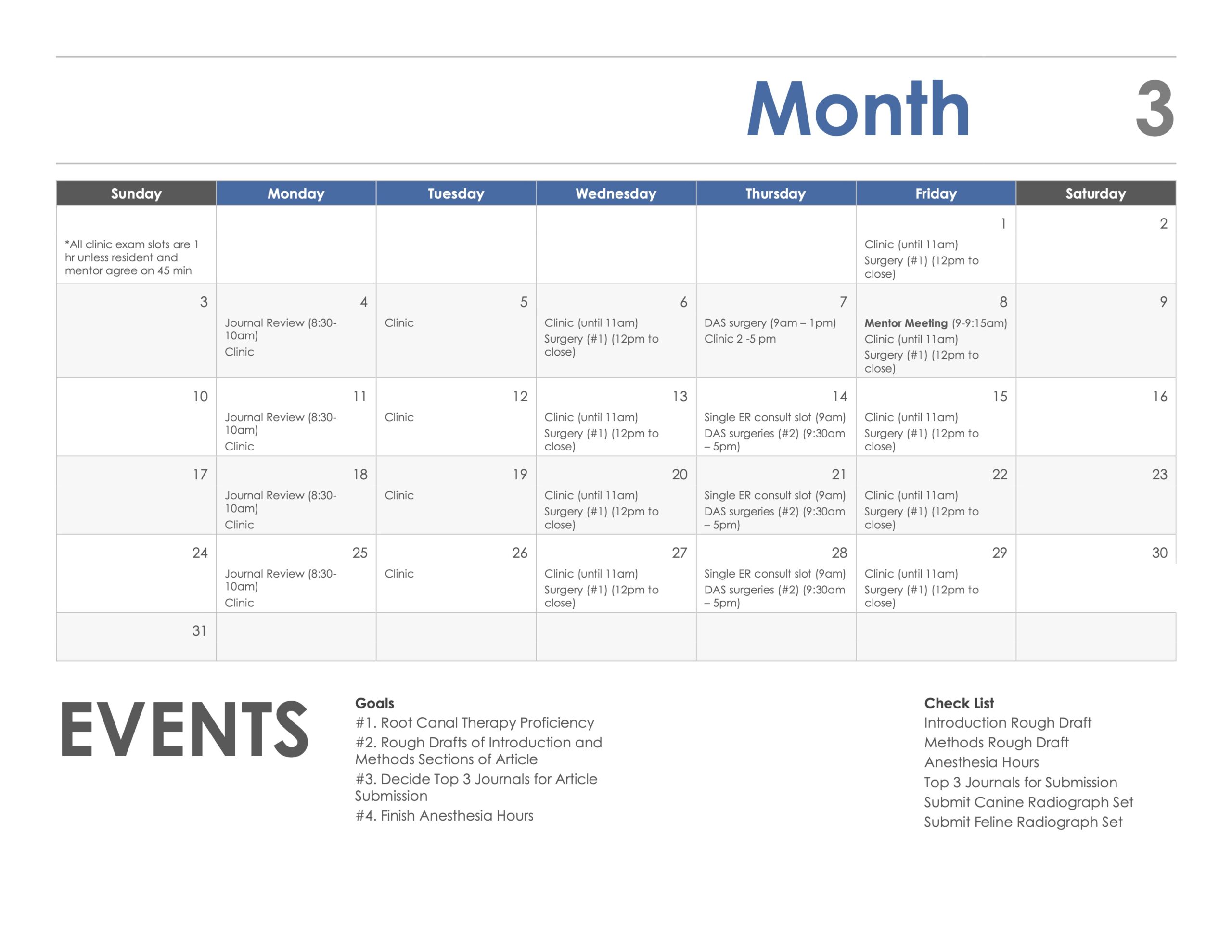 - These calendars are to be used as guides for the resident and mentor and may be changed at any time per the residency director’s, mentor’s, and/or practice manager’s discretion. There are many variables (speed of learning, surgical speed, time off, changes in learning goals, etc.) that may lead to change(s) to these calendars.