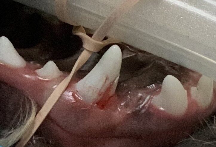 Figure 1a: Intraoral dental pictures revealing the severe subgingival fracture of the maxillary canine tooth. The tooth is still vital, as evidenced by the bleeding pulp.