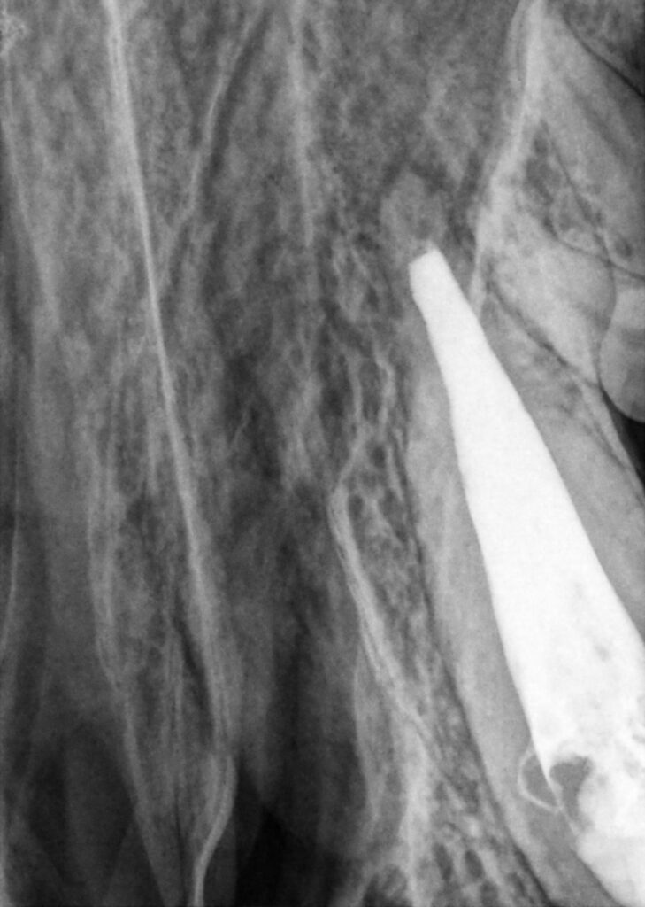 Figure 7: Post-operative dental radiograph of the endodontic treatment confirming a complete fill and good apical seal.