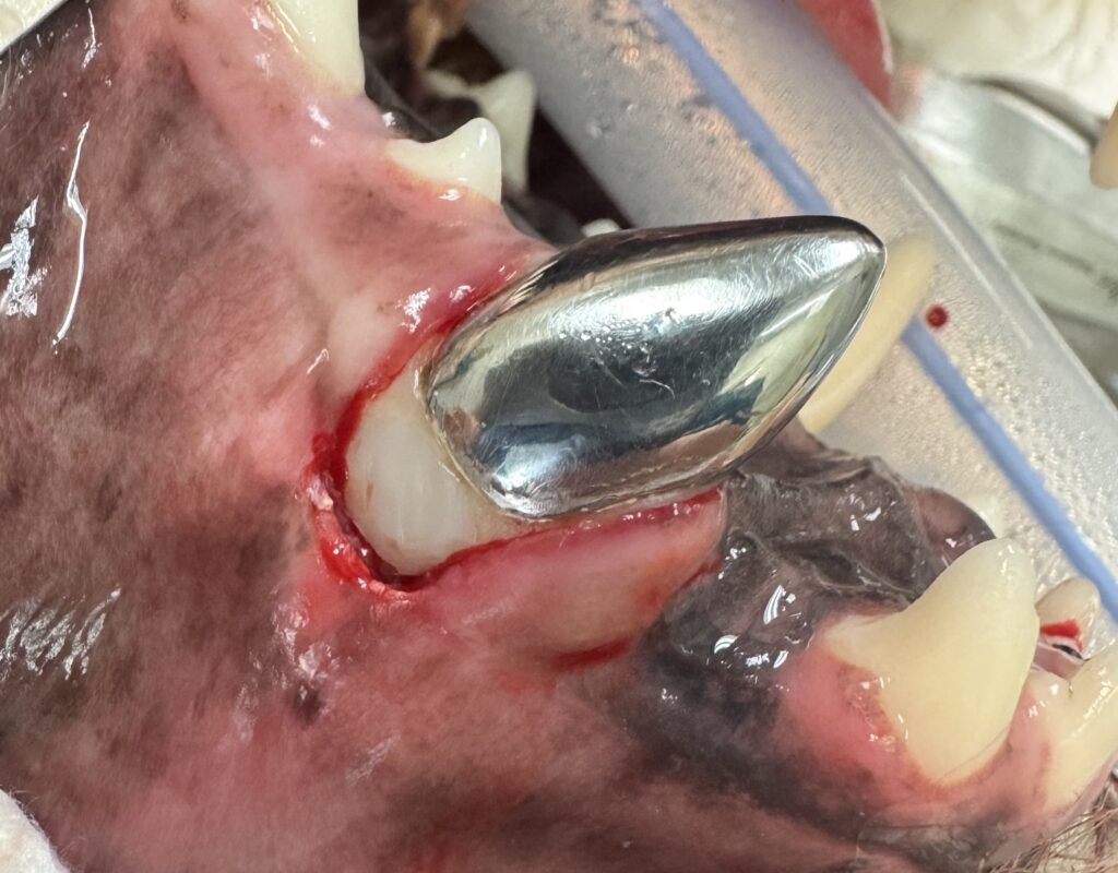 The tooth was treated with standard endodontic therapy (Figure 7) and prepared for a titanium crown (Figure 8). The client was instructed on home care and to recheck in 6 months.
