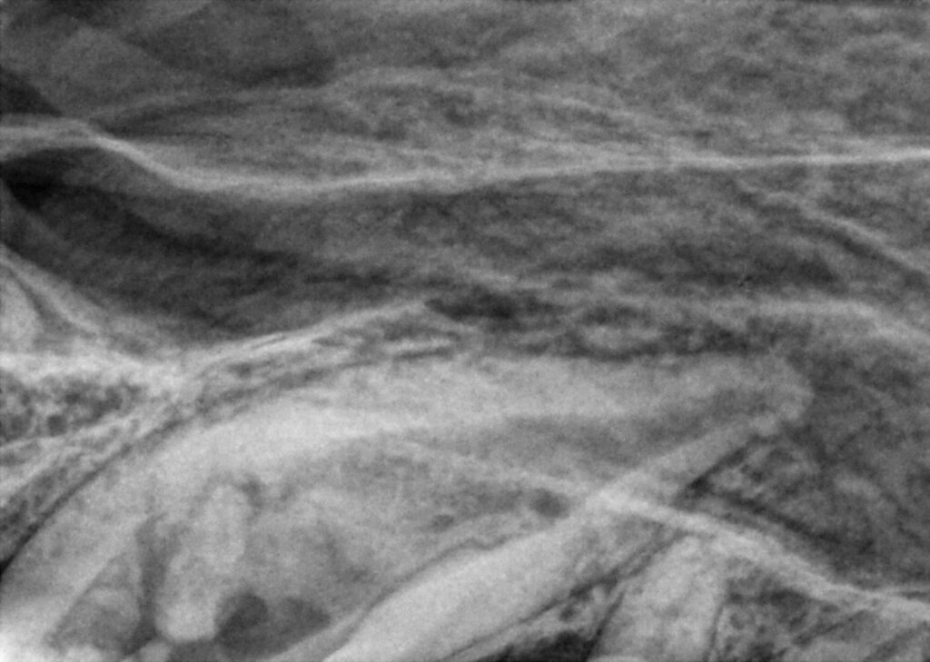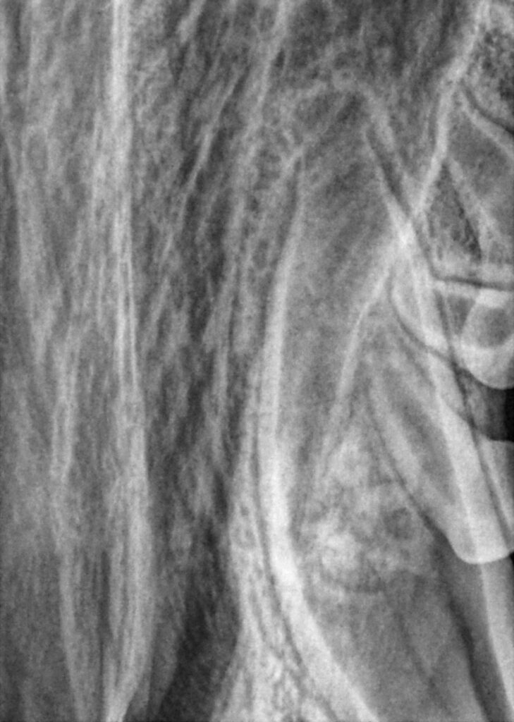 Figure 9: 1-year recheck demonstrating that the tooth is intact. There is some gingival recession with calculus covering the exposed root, but minimal periodontal inflammation