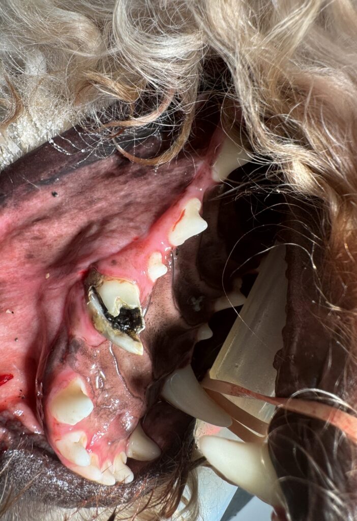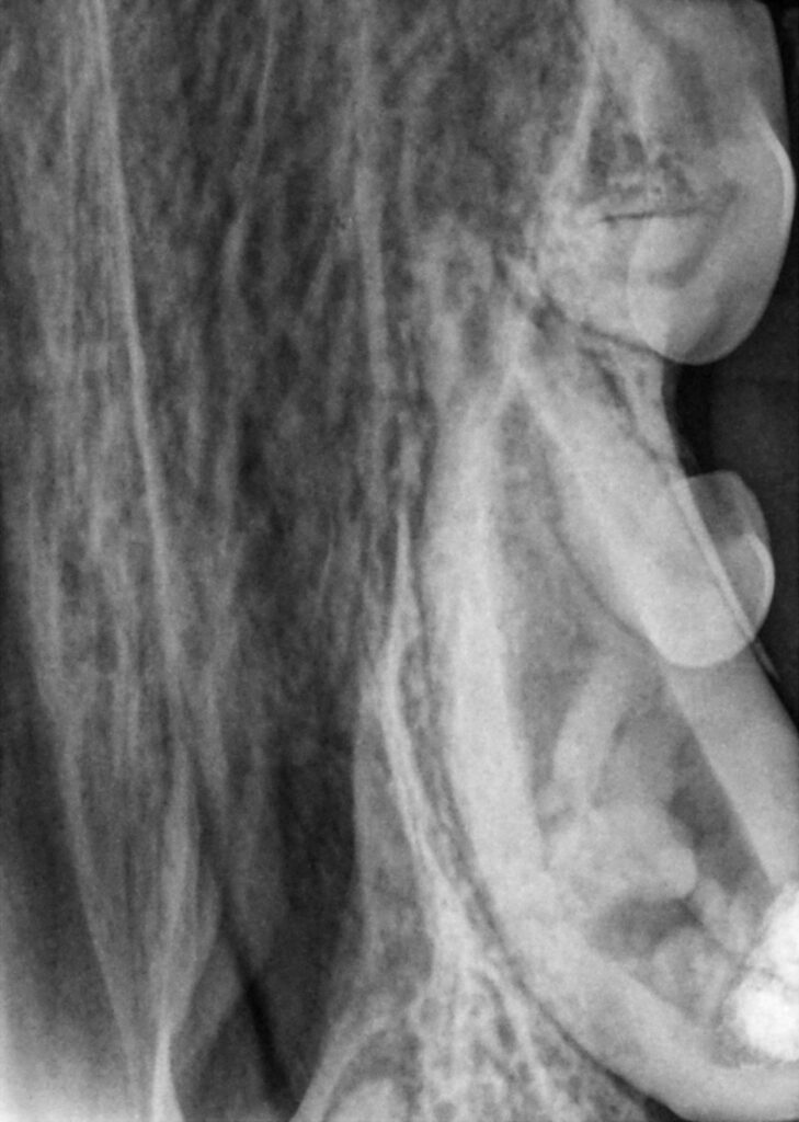 The patient was placed under general anaesthesia, and an exam and dental radiographs were performed (Figure 3). This confirmed the absence of a complete apex and the vertical root fracture.