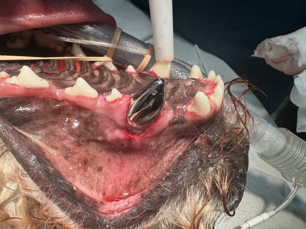 The first step was to create a periodontal flap to restore the vertical root fracture and prevent leakage. Next, vital pulp therapy was performed (Figure 3) to protect the tooth and (hopefully) allow it to mature to the point of receiving root canal therapy in the future. The subgingival defect was restored with glass ionomer to allow for superior periodontal attachment. Finally, the flap was sutured (Figure 4).